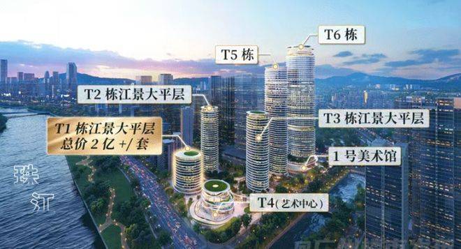 整体规划:6栋主体建筑,涵盖顶奢公寓、奢华酒店、艺术中心、高端商业等