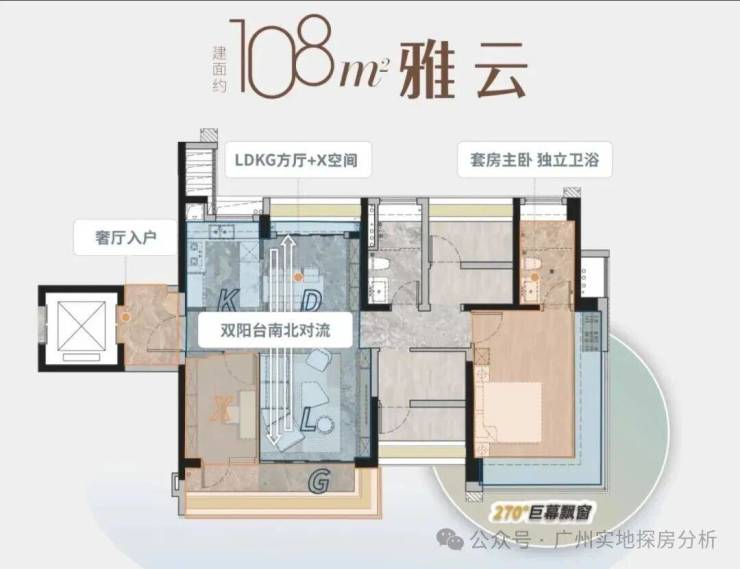 建面132㎡户型,专梯入户,约8.3米跑道型阳台单边位,南北双阳台,LDKG一体化设计,大方厅面宽约5.3米,主卧270度景观飘窗,私密性很好。