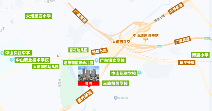 项目所在的火炬邻东区板块,属实至名归的中山富人区。作为一座宜居、宜业、宜游的城市板块,片区内配套设施,可以说十分醇熟。