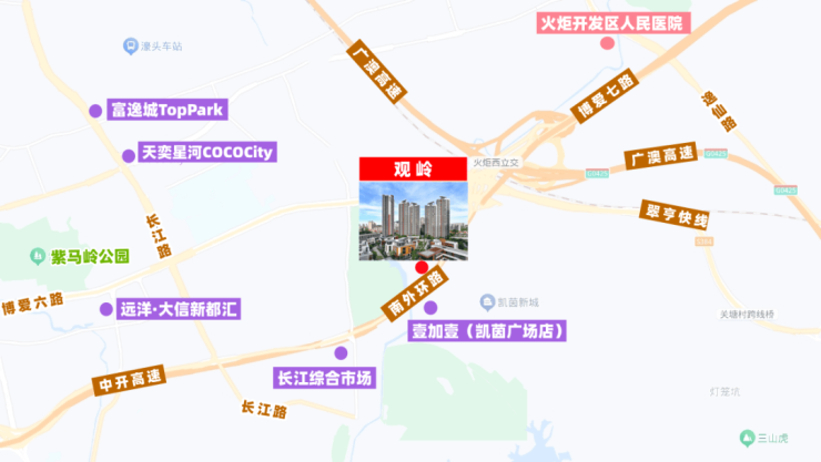城市主干道,往往也是商业聚集地。观岭地处中心城区,又位于南外环上,项目所在约5公里范围内,便覆盖有商业、医疗、教育、公园等配套。