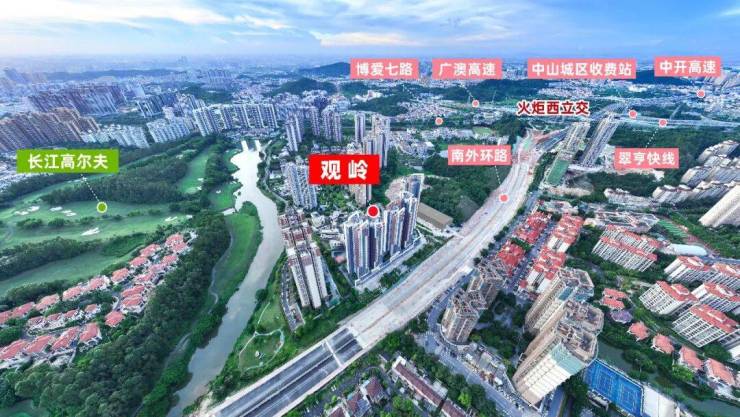 项目毗邻中山东西向双主干道,南接南外环,北连博爱七路。项目毗邻五桂山国家级自然生态保护区及长江水库,坐观190万㎡高尔夫果岭景观。