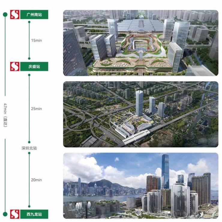 广深港高铁上汇聚新鸿三大TOD地标巨作(南站ICC-庆盛枢纽TOD-西九龙高铁站上盖发展项目),一轨之上港穗互联,比肩世界,总投资额高达近千亿。