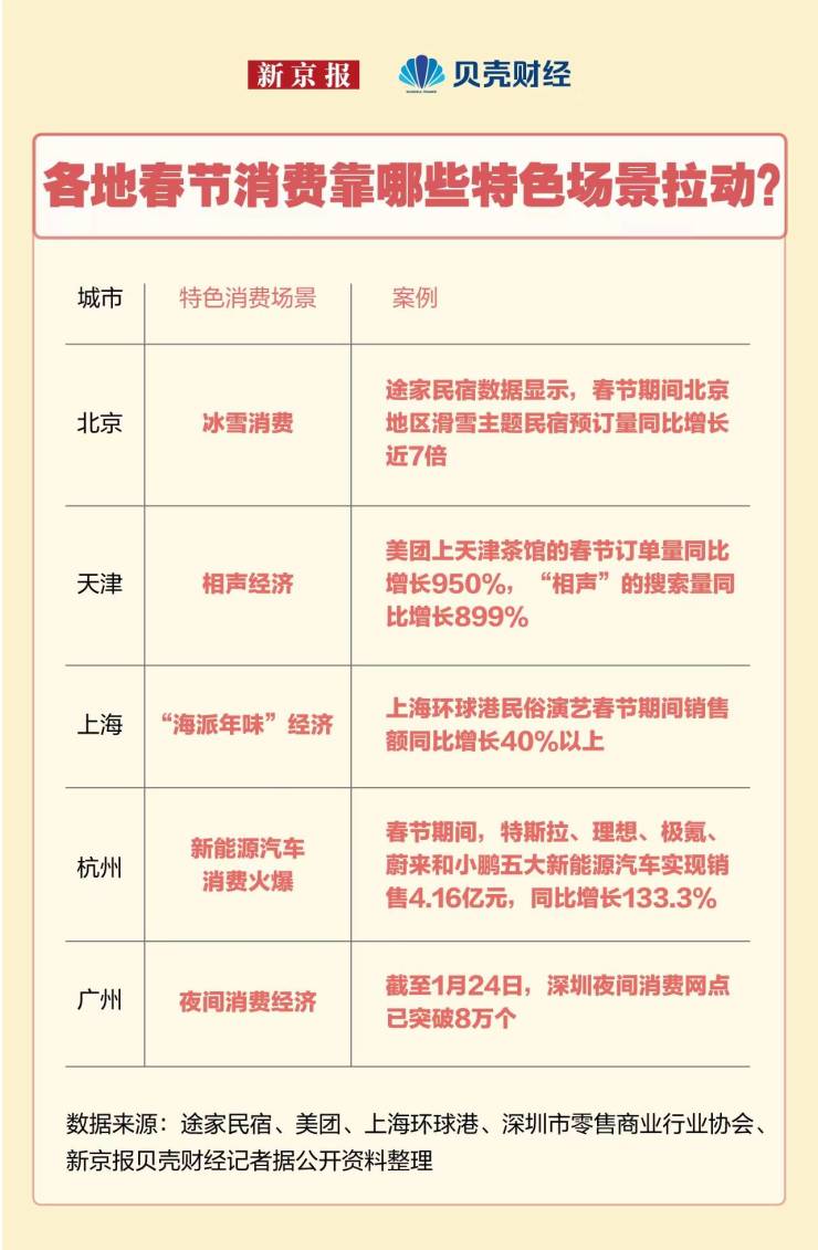 北京冰雪消费持续“热”, 途家民宿数据显示,春节期间北京地区滑雪主题民宿预订量同比增长近7倍。天津的相声茶馆热闹非凡,美团上天津茶馆的春节订单量同比增长950%。夜幕降临,广州的夜间消费节也推动消费潜力释放。