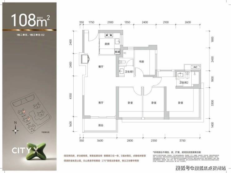 108平的户型拥有约3.6米开间,全南向客厅和卧室。