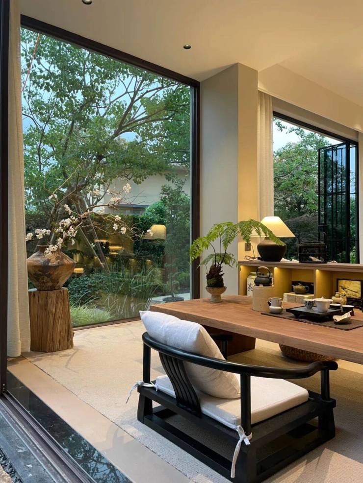 不得不提的是多功能茶室,让每一次品茗都成为生活艺术。盘腿而坐,眼前是整面花园景观,春赏花开,夏听蝉鸣,秋观红叶。这里不仅是待客的雅室,也可以是你的书房,甚至是孩子们的玩耍空间。