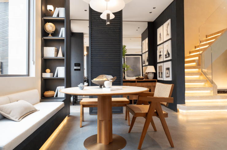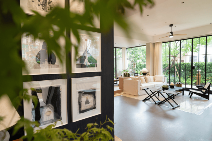 穿过花园步入别墅一层,三面环绕的全景落地门窗将室内外空间完美交融。阳光透过玻璃温柔洒落,透亮了整个空间。