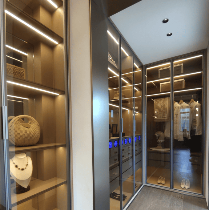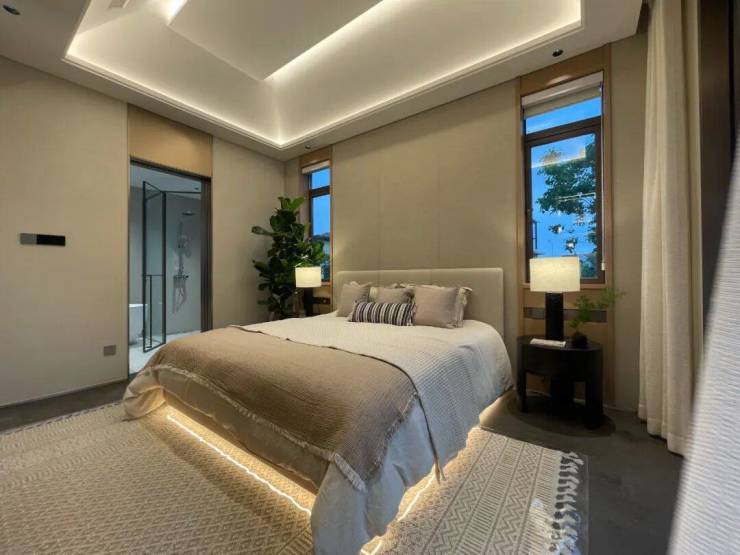 而48㎡的主人套间堪称奢享典范:步入式衣帽间如同一个时尚艺廊,让更衣变成一场充满仪式感的私人秀场;五星级标准卫浴空间,正对庭院美景一览无遗;最令人心动的是私属阳台,摆上两把舒适的休闲椅,便是绝佳的观星圣地。