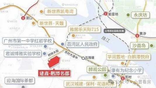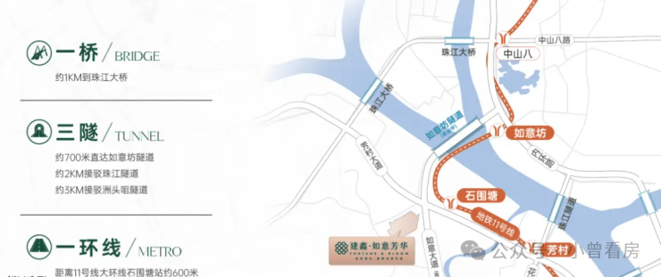 建鑫如意芳华扎在白鹅潭核心区,离在建的地铁11号线石围塘站只有600米,这条大环线贯通天河、琶洲
