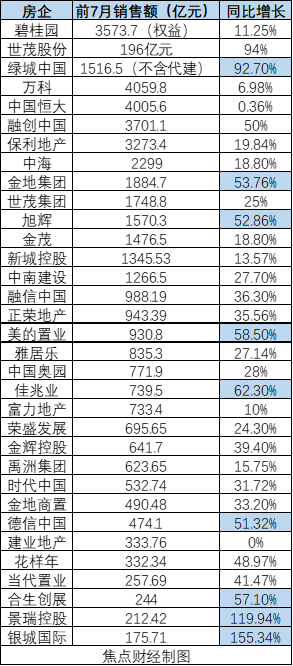 Top50房企中,也有不少表现亮眼。其中,绿城中国前7月合约销售额达1516.5亿元(不含代建),同比大增92.7%;佳兆业同比增长62.3%至739.5亿元;美的置业、旭辉、金地分别同比增幅超五成;金辉控股、时代中国、融信、正荣地产等增幅均超30%。