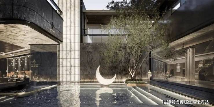 横向跨度再加以弧形边框,在色彩与材质方面运用古铜色铝板承接传统美学与极简现代化的色彩,质感十足,清雅的同时又不失尊贵感。