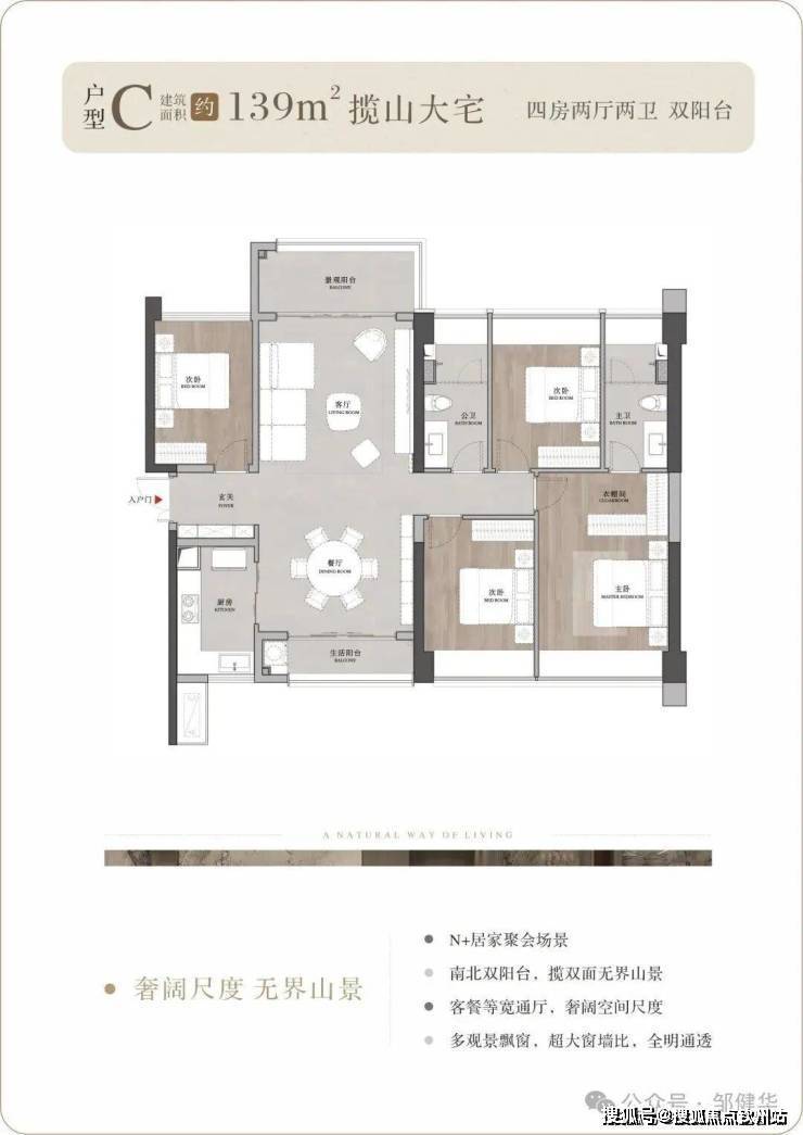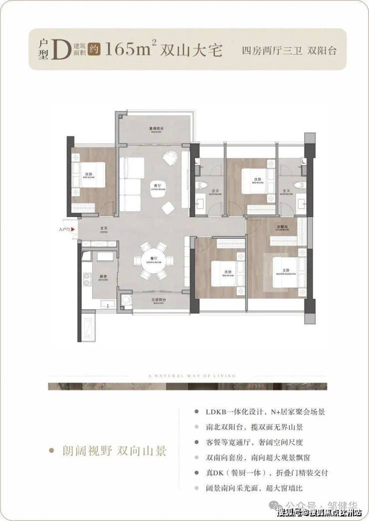 户型背山面海,超大的窗墙比将窗外无价的山海资源揽入户内,所有户型都可以看到开阔的山景,部分户型高楼层可以同时看到山海景观;南向大面宽、小进深,结合现代人家居理念的LDKB一体化设计,打造城市之芯的巨幕山海。