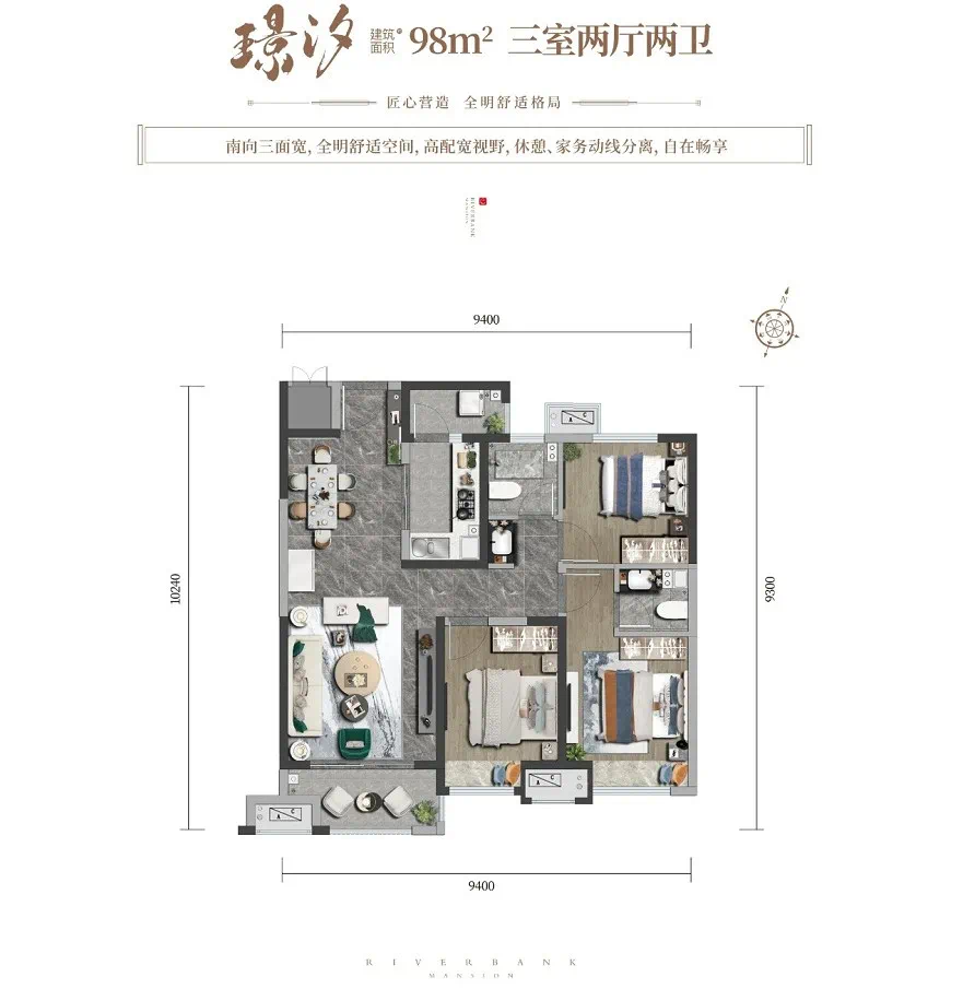 建面约98㎡,三室两厅两卫:格局方正,南北通透;三面朝南;主卧套房,独立卫生间,私密性高;南北双阳台,南阳台与客厅一体,延伸景观视野;双卫生间,且都为明卫。