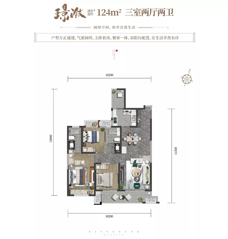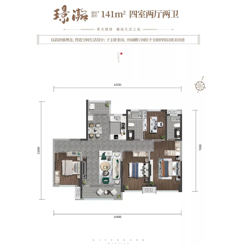 而其建面约197㎡的四室两厅三卫户型,则以大面宽设计、双卧套房、阔绰横厅、南北双阳台配置,更是彰显府第气象。