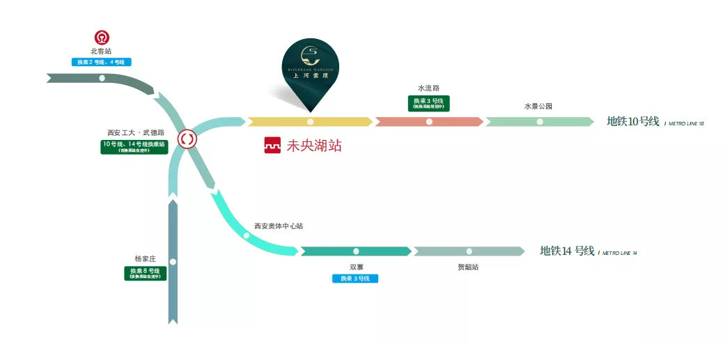 双地铁,“地铁盘”价值凸显。地铁14号线和10号线(在建),呈“十字形”途径项目所在区域,上河雲璟距离10号线未央湖站(在建)仅约180米起,属于纯粹的“地铁盘”。