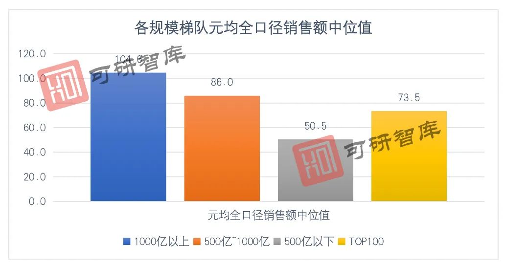 其中,千亿级以上房企的元均全口径销售额中位值超过了百元水平,领跑行业。而500亿~1000亿梯队的房企元均全口径销售额小幅落后,为86元。500亿以下房企的元均全口径销售额进一步下降到50元左右,低于行业中位水平。