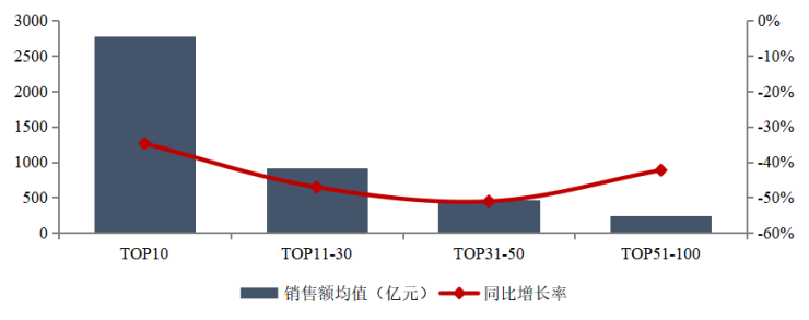 各阵营房企销售额增速均有所下滑。其中,TOP10房企销售额均值为2783.9亿元,较上年下降34.8%;TOP11-30房企销售额均值为911.9亿元,较上年下降47.2%;TOP31-50房企及TOP51-100房企销售额均值分别为461.0亿元和239.4亿元,同比分别下降51.1%和42.3%。