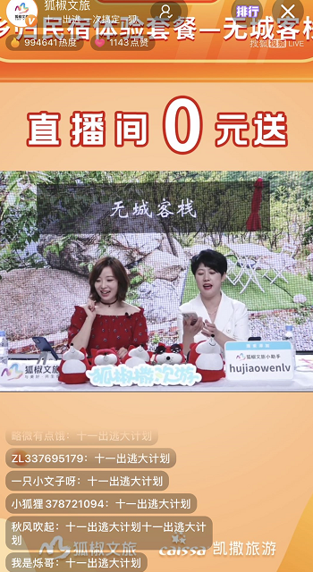 直播当晚,狐椒撒欢游引潮微博话题,燃动微信社群,通过挖掘兴趣用户,分享旅居度假乐趣,吸引了大量关注。加之活动前多场预热直播接连放送,狐椒星主播火力全开,以青春活力的姿态和的趣味互动,为秋日出游增添了多重亮色。直播最后,狐椒星推官对即将重磅推出的大理的小院子疗愈之旅、河南皇家驿站历史遨游之旅、芒市傣族古镇文化体验之旅、楚雄彝人古镇民族风情之旅进行了预热。