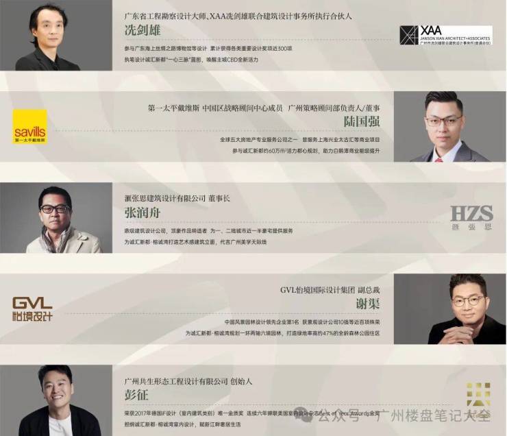 【五大设计规划巨匠 迭新城市封面】邀请XAA冼剑雄联合建筑设计事务所「冼剑雄」先生,以及世界物业服务五大行之一「第一太平戴维斯」执笔设计大城蓝图,融入茶滘水道、花地河、铁路遗址等元素,打造“一心三脉”格局。联手汇张思、怡境国际和共生形态等知名设计机构打造高品质住宅产品。