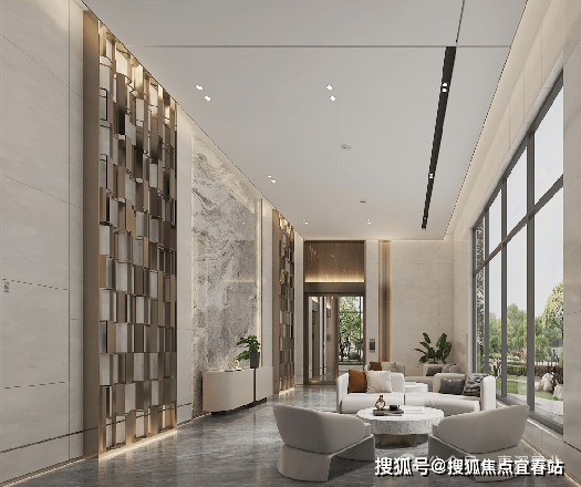 『双精装入户大堂』尊崇归家:首层5.4m层高,搭配主背景岩板,天花铝板,门头金属加艺术玻璃通顶设计,尽显豪宅气质。