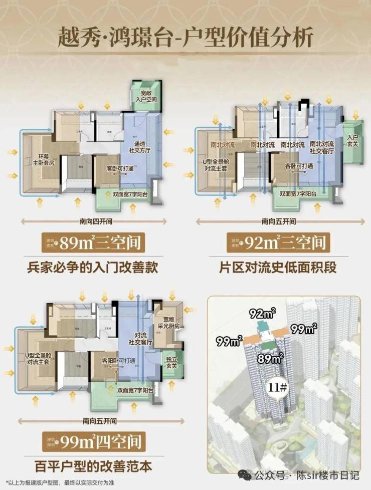 越秀鸿璟台项目首推1栋、11栋,11栋主打小户型,即建面约89-92-99㎡三至四房,1栋小高层板楼主打改善,为建面约110-112㎡四房。
