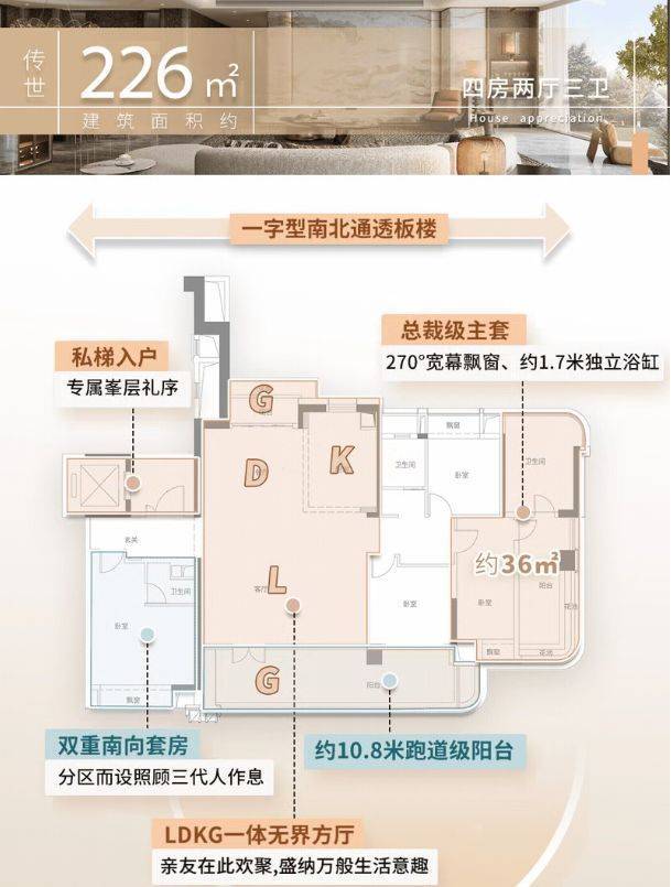 尤为值得一提的是约226㎡私梯入户板式大平层:两梯两户设计,每户独立电梯厅;LDKG+X超级聚厅体系,含豪华客厅、中西双厨、13.5㎡餐厅及10.8米跑道级阳台;双南向套房布局,主卧达36㎡,配备1.7米浴缸与美妆冰箱,真正实现三代同堂“合而不扰”的尊享生活。