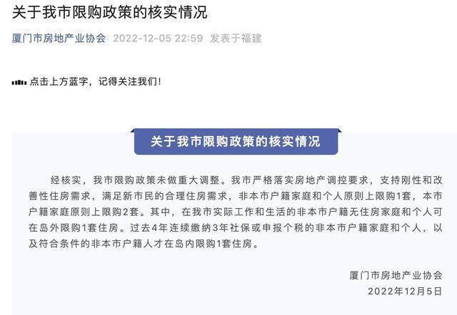 焦点财经讯 盼盼 12月5日,针对“厦门市岛外放开限购”的市场传闻,厦门房协官微发布消息称,经核实厦门市限购政策未做重大调整。