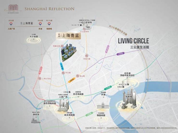 项目双轨交环绕,距离最近的8号线西藏北路站直线距离仅约500米,约1.5km范围内,还有3号线东宝兴路站。乘上地铁,从「新湖·上海青蓝」2站可以直达上海火车站、3站直达人民广场,4站到达南京西路、5站到达陆家嘴……便捷交通,通达全城热点板块。「新湖·上海青蓝」区位示意图