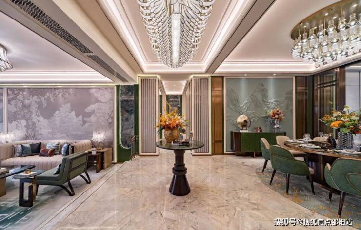 ✨过厅背景墙采用青绿哑光烤漆圆弧造型搭配绿翡翠岩板;