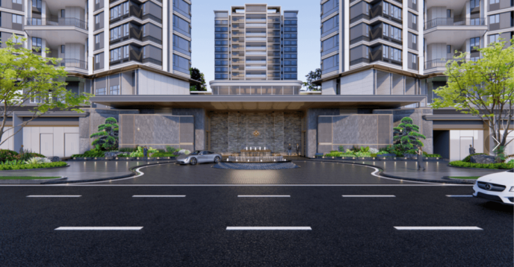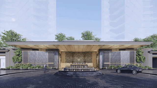 项目把主入口设计成了酒店式环岛,门楼高达7.7米,还规划了下沉式庭院。