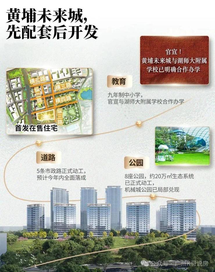 项目还规划了一所24班的小学,后期还会配建一所45班的九年一贯制学校。4所幼儿园更是大手笔,规划了18班+18班+15班+9班,完全对标黄埔新城的教育配套;
