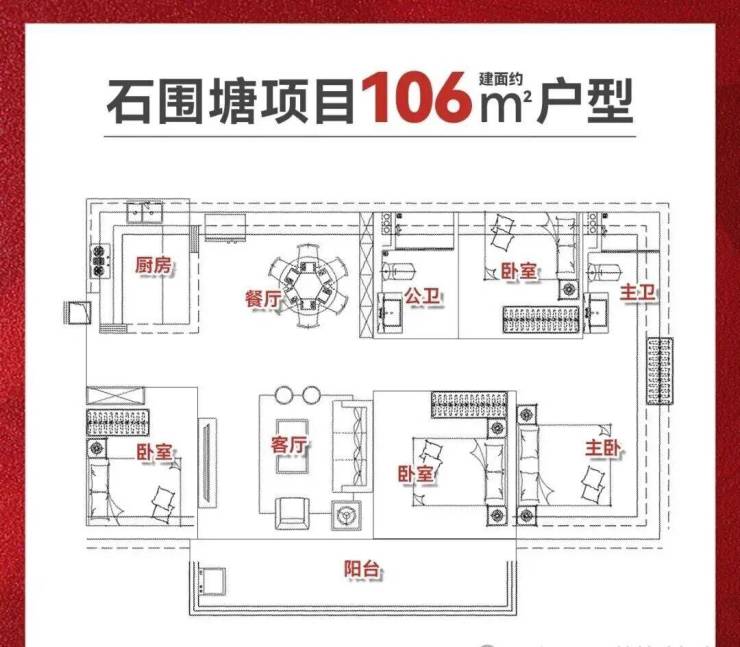 · 建面约106㎡四房:占据景观中轴线,四开间朝南搭配巨幕阳台,采光与通风性能极佳。主卧套房设计,配备步入式衣帽间与独立卫浴,兼顾私密性与尊贵感。全屋约14.8㎡不计入建面,实得率超112%,性价比优势显著。