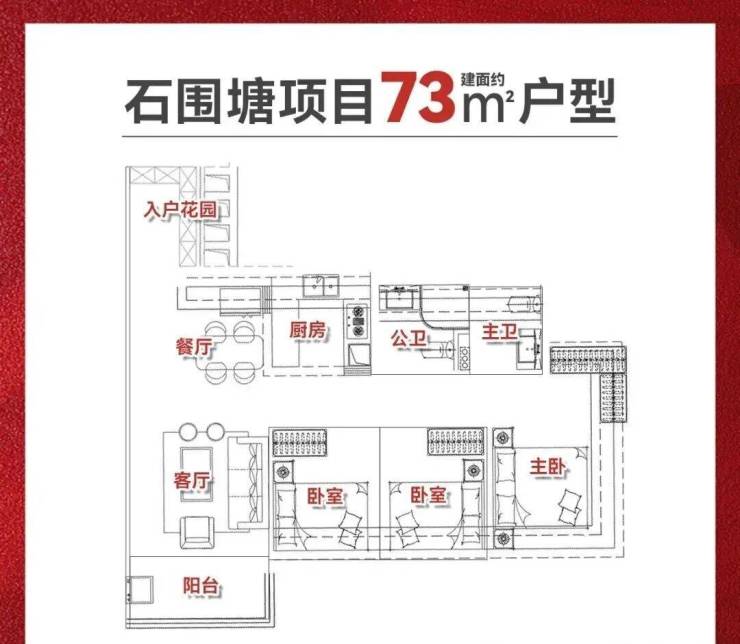 · 建面约73㎡三房:采用竖厅设计,三开间朝南,主卧配备270°转角飘窗,拓宽视野的同时增加实际使用面积。全屋飘窗设计使实得率超116%,相当于多出一间卧室的空间,堪称“小户型大作为”的典范。