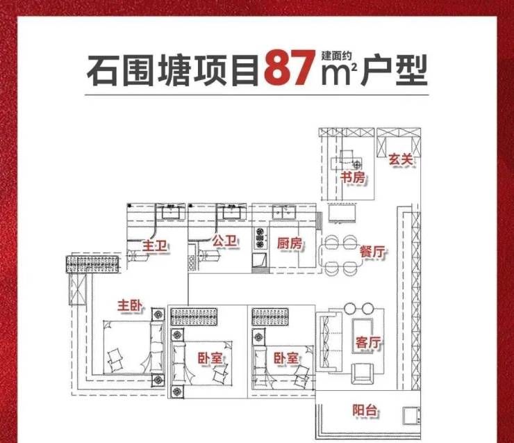 · 建面约87㎡三房:实现四开间朝南,南北通透,餐客厅一体化设计连接宽景阳台,形成通透的公共活动空间。U型厨房操作台面充裕,满足多人同时烹饪需求,适合三代同堂家庭。