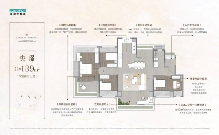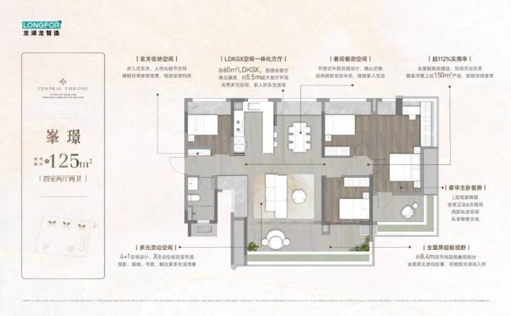 建面125㎡四房两厅两卫,南北通透,8.4米大阳台。