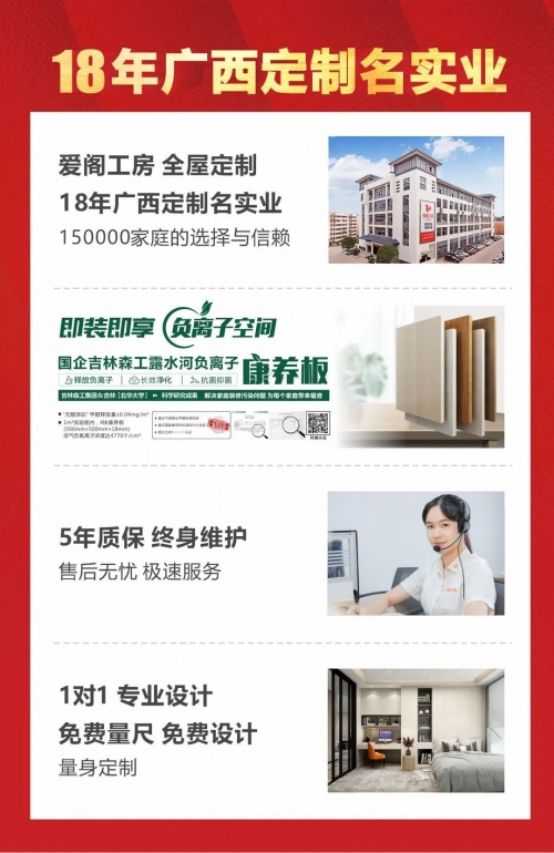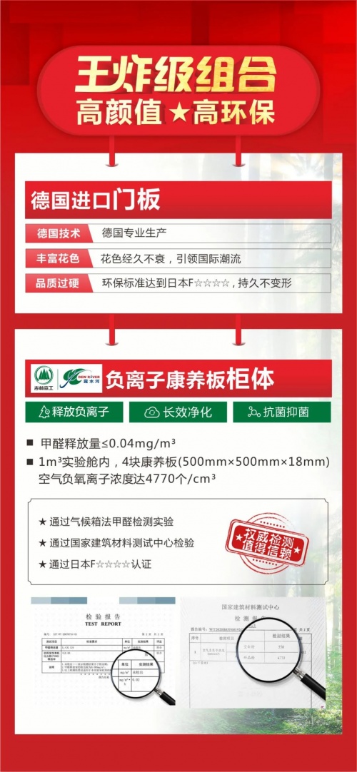 王炸级组合带来的是高质量产品与绿色环保的新家。人的一生大概有2/3的时间是在室内度过。老人在家时间≥20小时,孩子在家时间≥12小时,如果室内环境受到有害气体污染,对人体的损害是不言而喻的。作为一家心怀社会责任感的企业,爱阁工房死磕“环保”二字,坚持严选环保板材,引进国企吉林森工露水河负离子康养板,爱阁工房为广西少有授权单位,再掀环保普及风暴,开启家居健康新“净”界。简奢套餐严选德国进口门板+国企吉林森工露水河负离子康养板柜体,高颜值、高环保。