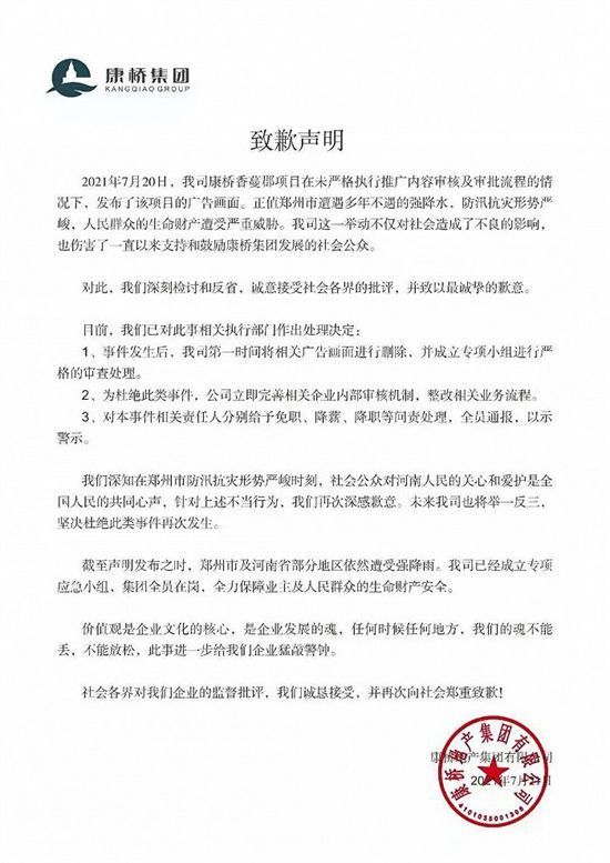 作为郑州的本土房企,不是承担责任,反而硬生生地要在这场自然灾害面前刷存在感,在一众网友的口诛笔伐下很快,今天早上康桥集团发布了致歉声明,声称会严格处理对相关责任人.