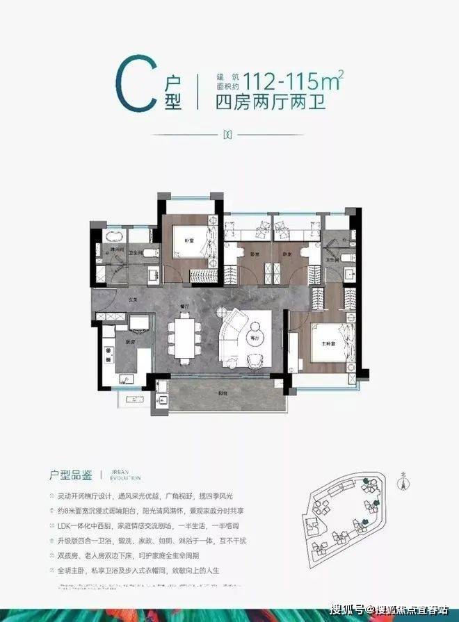 户型分布,79-81㎡的3房1卫朝向为西南向,99-102㎡的3房2卫作为主力户型朝向为正南向,而112-115㎡的4房2卫的大户型朝向为南北通透。