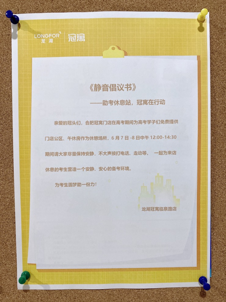 值得注意的是,冠寓在每个门店都公示了一张“静音倡议书”。门店运营官解释道:“这是全国冠寓门店统一的服务动作,除我们自己的工作人员严格遵守外,还会通过线上线下的方式向门店租户发起倡议——高考期间尽量保持安静,不大声接打电话、走动等,帮来店休息的考生营造一个安静、安心的备考环境,为考生圆梦助一份力。”