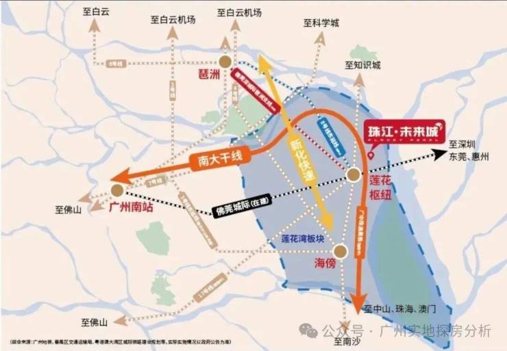 其区位优势,源于广州南站作为粤港澳大湾区核心交通枢纽与门户的不可替代性,以及珠江后航道沿岸价值的重估潜力。地处 “广州南站商务区”江岸核心带,这里不仅是华南地区最大高铁站所在地,更是广佛同城、深化大湾区融合的“桥头堡”。项目踞守于此,意味着同时占据了 “世界级枢纽流量”与“稀缺城市江景” 双重战略资源。地段价值不仅体现在当前庞大的客流与便捷的交通,更在于其作为广州南部重要发展极所承载的产业升级、人口集聚与城市界面全面焕新的巨大机遇,是分享枢纽经济与滨水价值红利的战略要地。