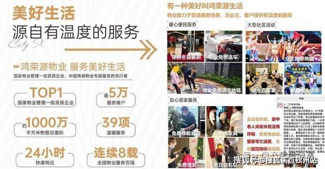 鸿荣源物业以“服务美好生活”为企业使命,秉承“尽心尽意,惟精惟诚”的服务理念。截至目前,鸿荣源物业服务面积逾1000万平米,服务客户超5万户,39项温暖服务,24小时快速响应,连续8载全国物业服务百强。