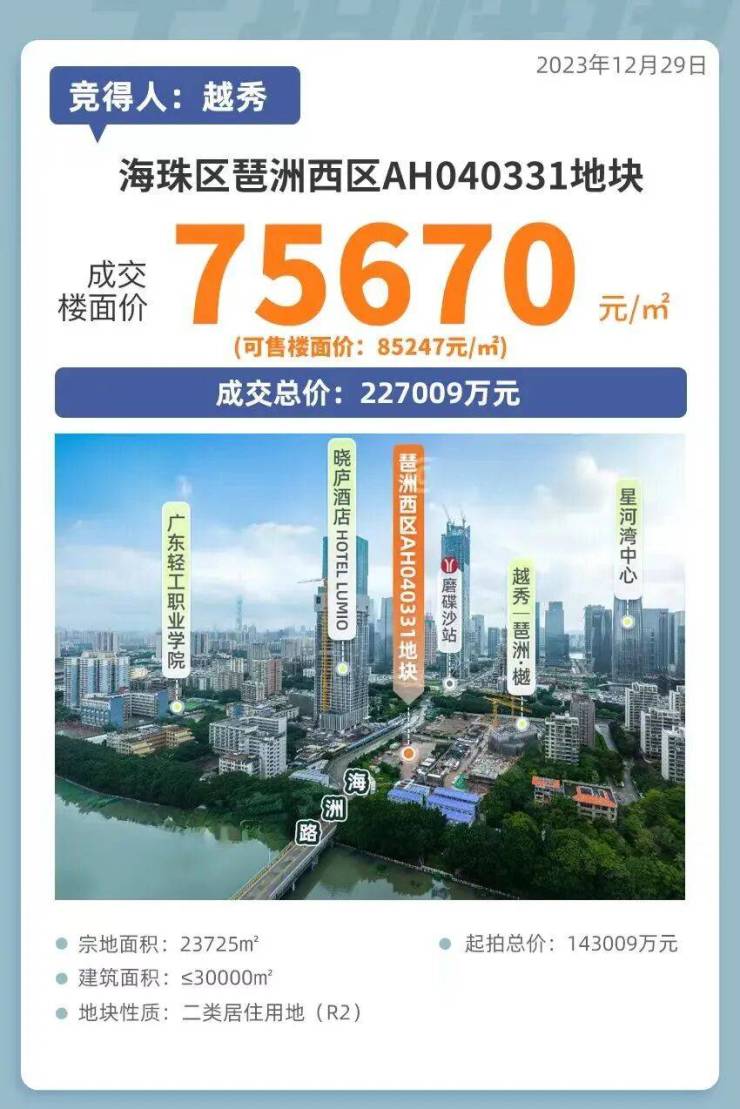 2023年最后一个工作日,琶洲西区AH040331地块被越秀地产广州区域摘得,折合楼面地价超7.5万/平,一度冲上全国地价TOP6。
