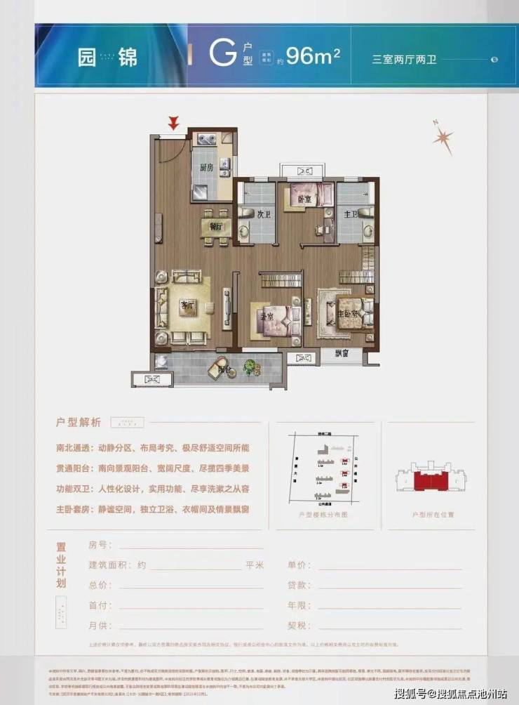 建面约96平的G户型,三房两厅两卫,此户型位于2号楼,这个户型和建面约101平的D户型几乎一模一样,但是因为是18层的高层,比34层的2号楼楼层更低,公摊更小,所以即便面积小,也能设计为2卫。