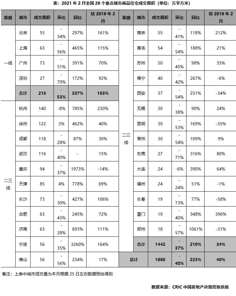 从成交看,2月热度延续,稳中有增。29个重点城市整体成交1660万平方米,环比下降40%,同比增长223%;较2019年同期则增长了30%。