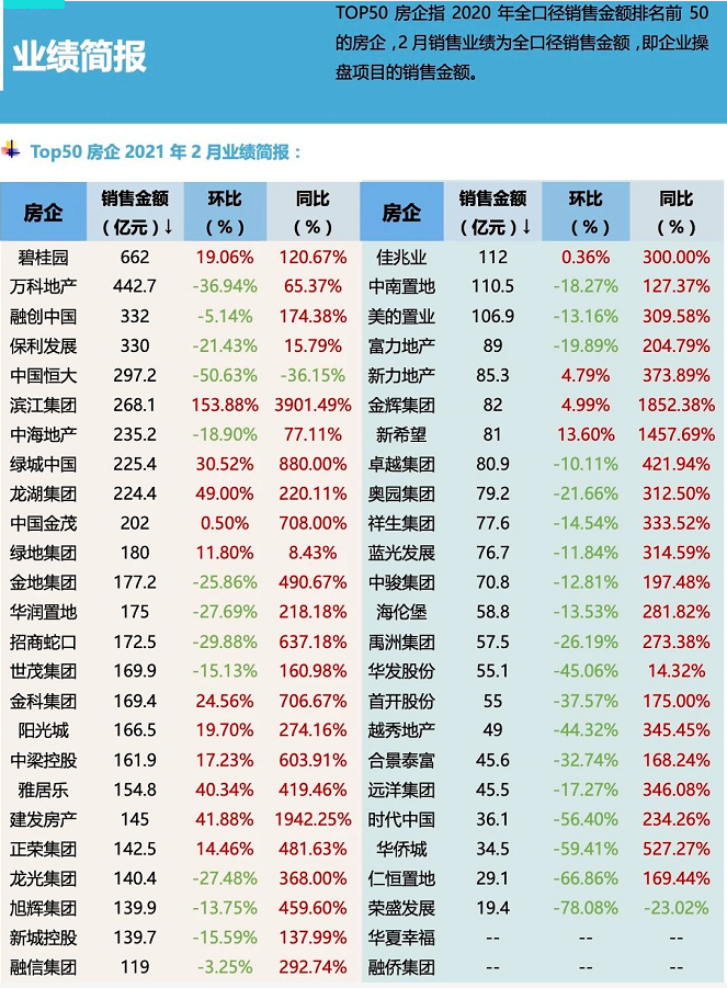 从近日房企公布的2月份业绩简报可以发现,大多房企2月份的销售额环比出现明显下降,但同比则出现大幅上涨。这与去年同期受疫情影响有关。