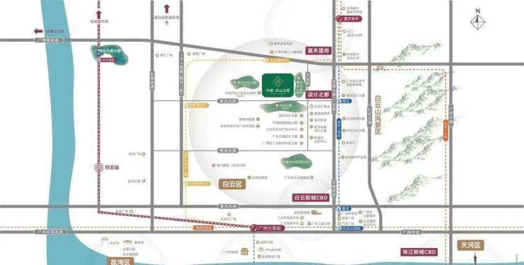 地铁2号线:距黄边站(运营中)直线距离约800m,3站白云新城,直达江南西,广州南。1站换乘嘉⽲望岗(地铁2/3/14号线交汇)。