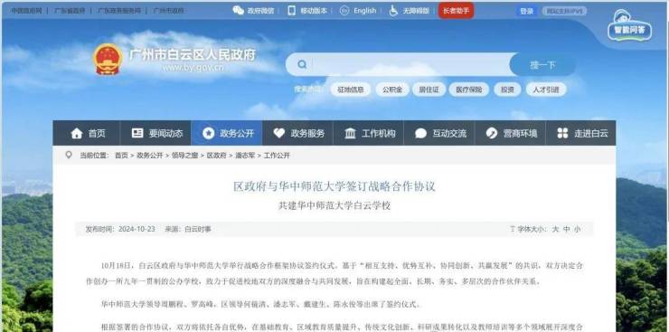 2024年10月18日,白云区政府与华中师范大学签订战略合作协议。