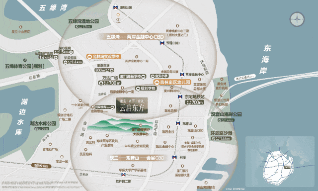 项目位于两岸金融中心片区莲山头板块,直径1公里内配套:湖里万达广场、银泰百货、厦门高新学校、两金启动区一期、厦大附属眼科中心,1.5公里内,五缘湾的弘爱医院、K11商场、软件园二期,学校先就读金林湾实验学校,项目左侧规划了一个“金林九年制”学校。