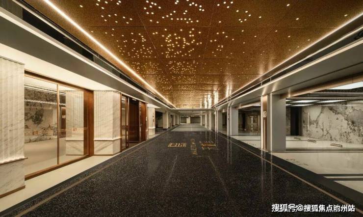 天樾玺的VIP车位,吊顶采用香槟金色的铝板装饰,背景墙则是用了岩板,每个车位都有自己的独一无二的纹理。