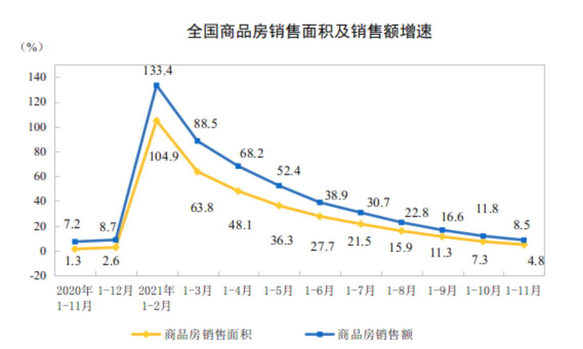 商品房销售量价方面,国家统计局数据显示,1—11月份,商品房销售面积158131万平方米,同比增长4.8%;比2019年1—11月份增长6.2%,两年平均增长3.1%。其中,住宅销售面积增长4.4%,办公楼销售面积增长2.0%,商业营业用房销售面积下降2.6%。