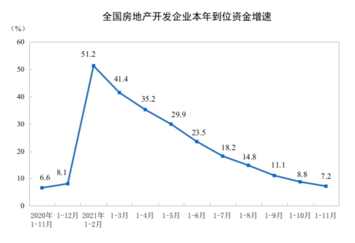 按照国家统计局数据,1—11月份,房地产开发企业到位资金183362亿元,同比增长7.2%;比2019年1—11月份增长14.2%,两年平均增长6.9%。其中,国内贷款21640亿元,下降10.8%;利用外资90亿元,下降41.7%;自筹资金59378亿元,增长4.8%;定金及预收款67156亿元,增长17.0%;个人按揭贷款29633亿元,增长9.8%。